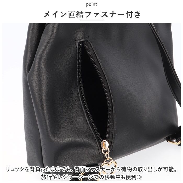 ・リュックを背負ったままでも、背面ファスナーから荷物の取り出しが可能。旅行やレジャーシーンでの移動中も便利◎