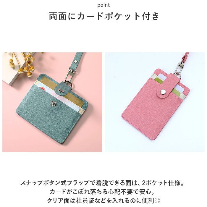 ・スナップボタン式フラップで着脱できる面は、2ポケット仕様。カードがこぼれ落ちる心配不要で安心。クリア面は社員証などを入れるのに便利◎