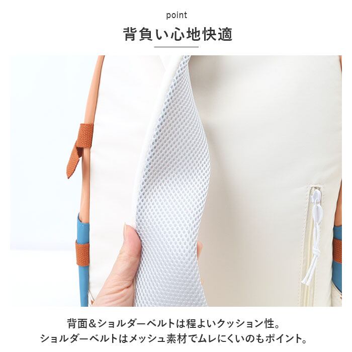 ・背面&ショルダーベルトは程よいクッション性。ショルダーベルトはメッシュ素材でムレにくいのもポイント。