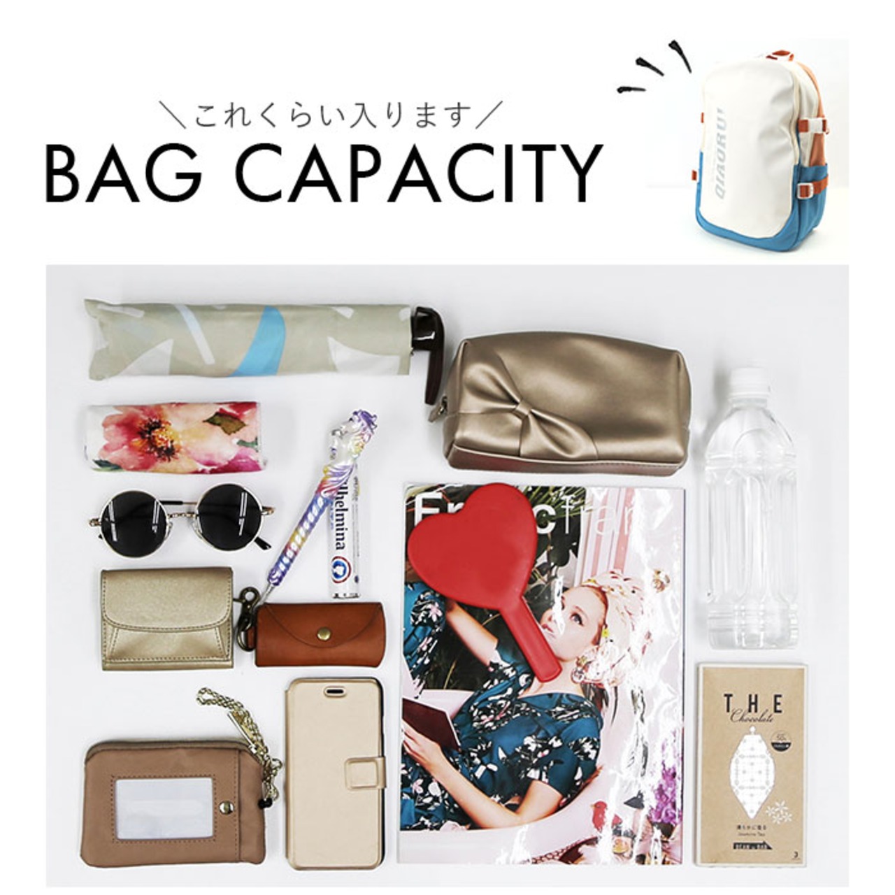 ・A4サイズが縦向きにすっぽり。程よくマチがあり、お出かけに必要な小物がすっきり収まるサイズ感。