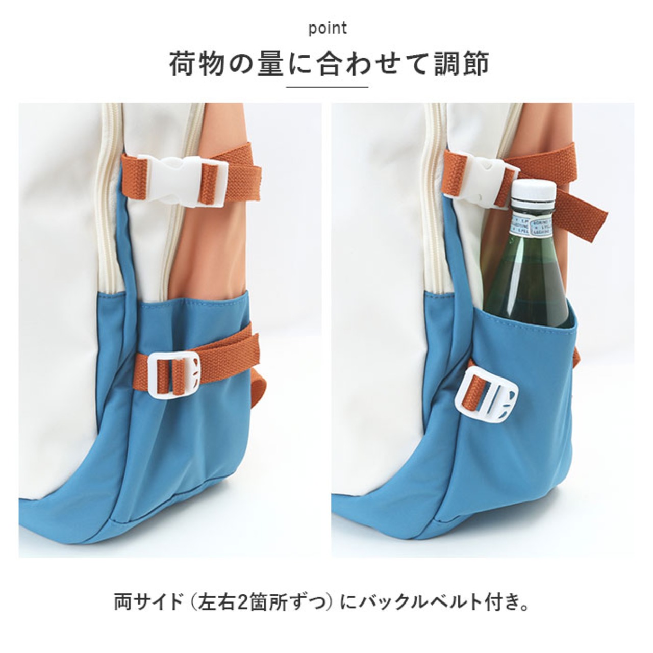 ・両サイド(左右2箇所ずつ)にバックルベルト付き。