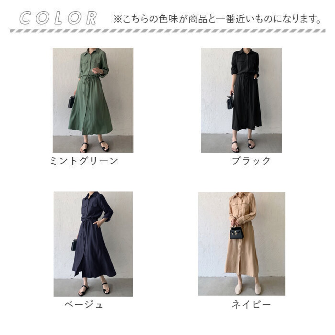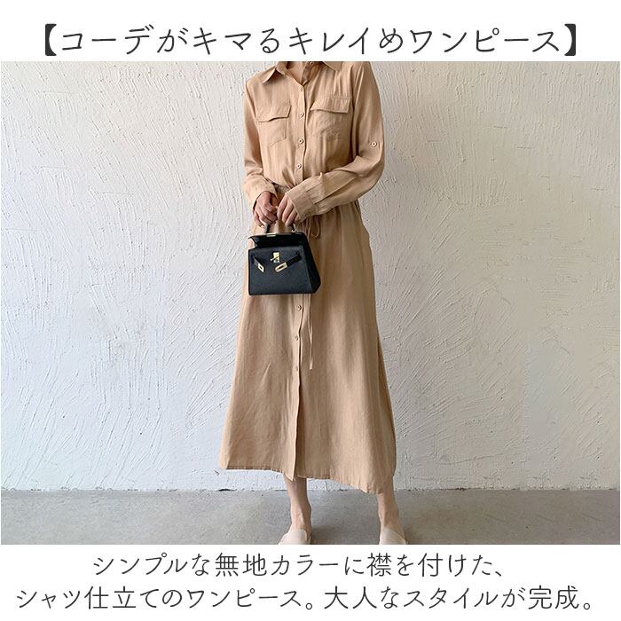 ・シンプルな無地カラーに襟を付けた、シャツ仕立てのワンピース。大人なスタイルが完成。