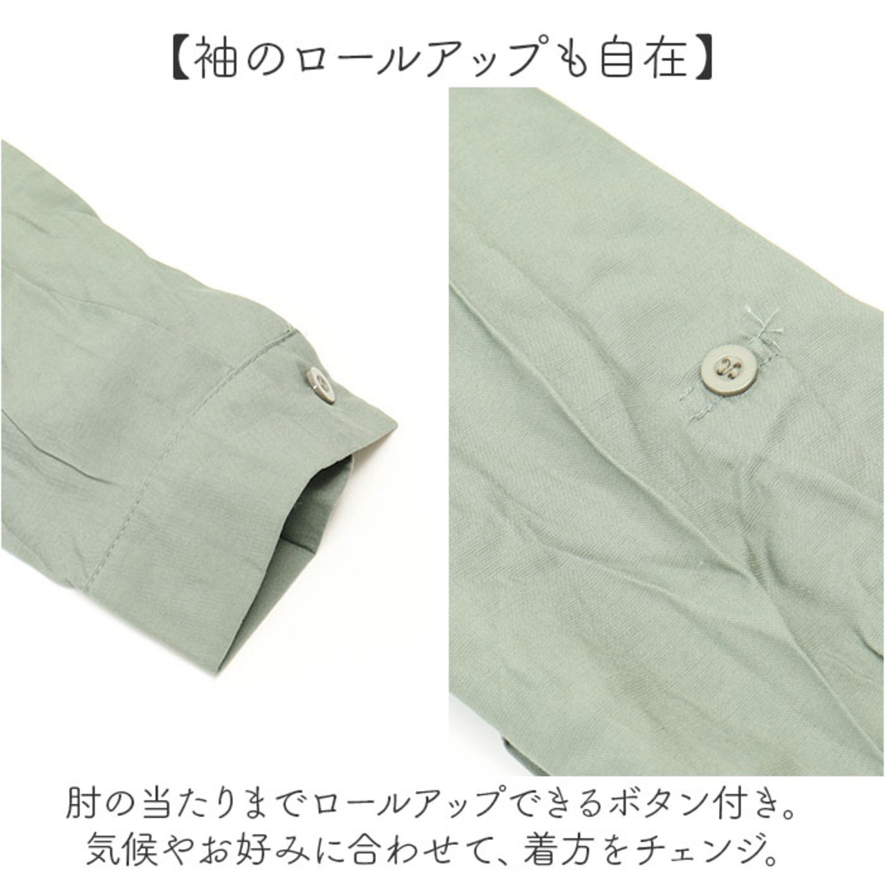 ・肘の当たりまでロールアップできるボタン付き。気候やお好みに合わせて、着方をチェンジ。