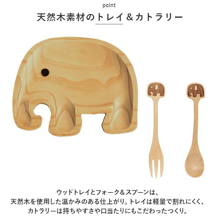 ・ウッドトレイ、フォーク&スプーン、タオルのセット。全て小さなお子さまが使いやすいよう設計。