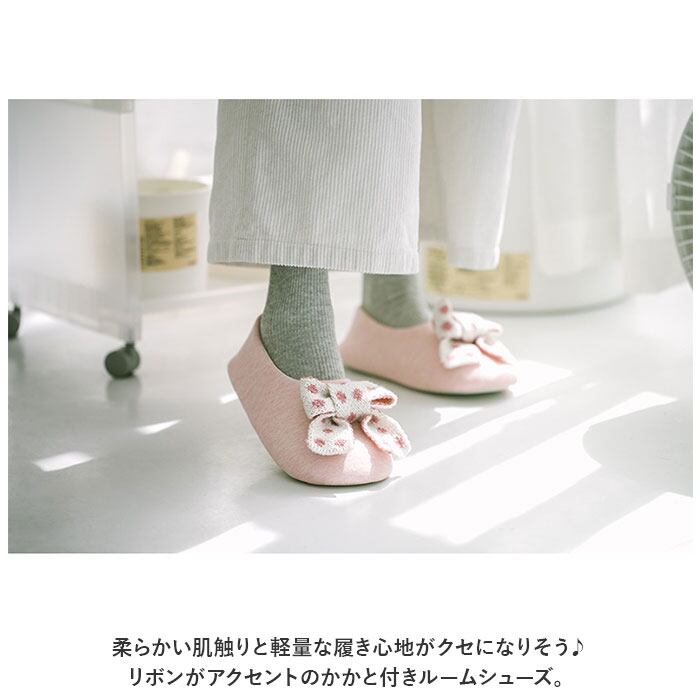 ・柔らかい肌触りと軽量な履き心地がクセになりそう♪リボンがアクセントのかかと付きルームシューズ。