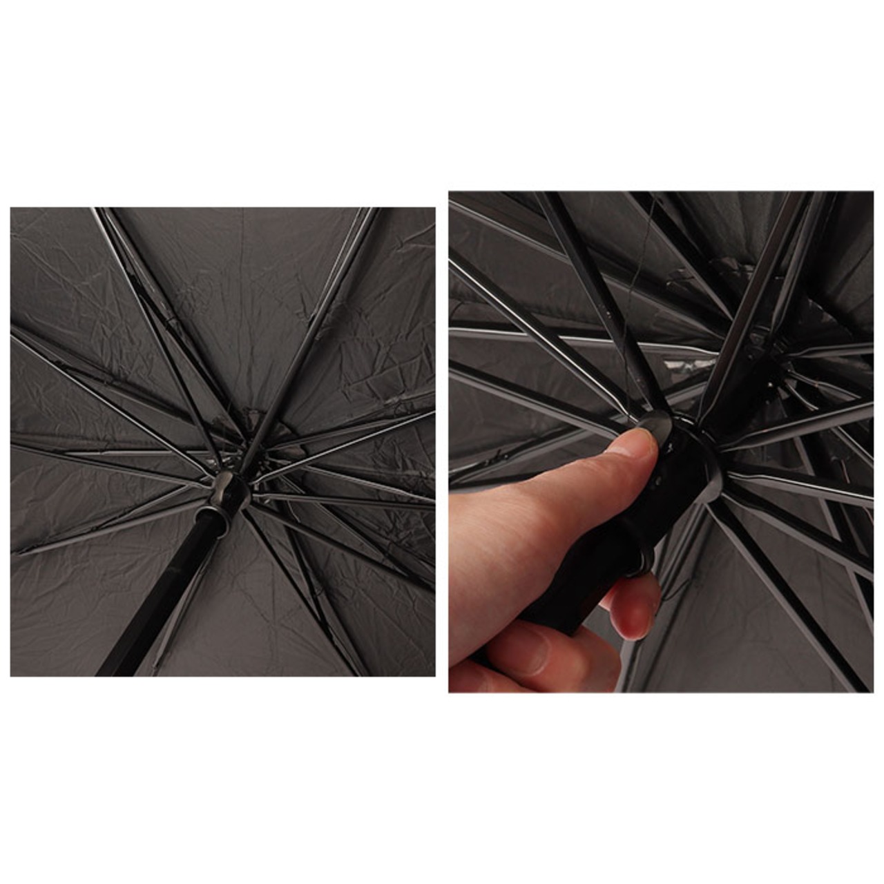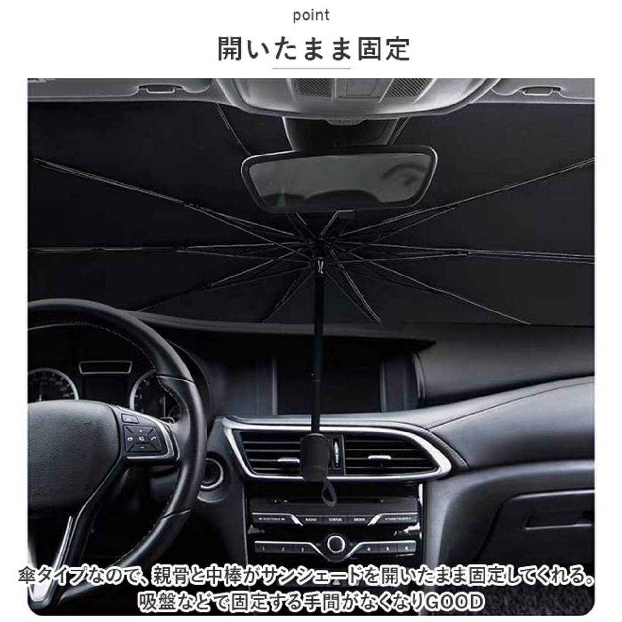 ・傘タイプなので、親骨と中棒がサンシェードを開いたまま固定してくれる。吸盤などで固定する手間がなくなりGOOD
