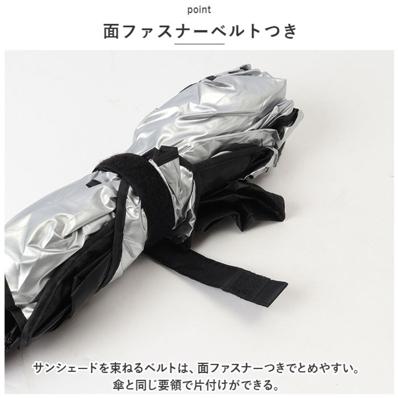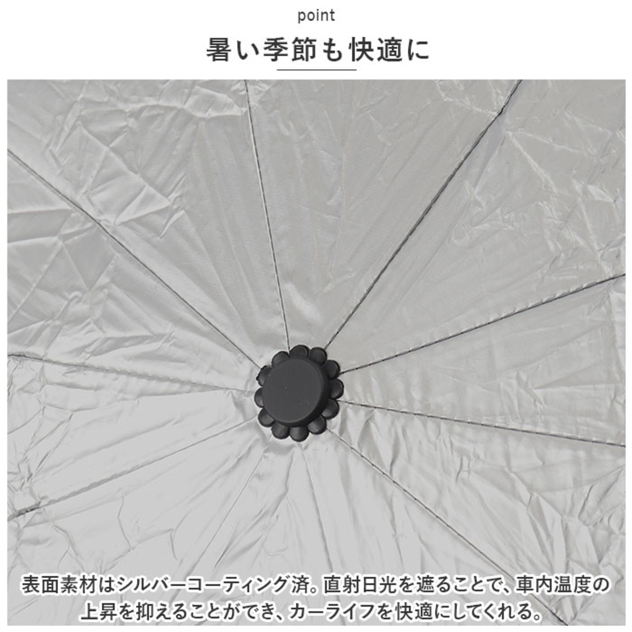 ・表面素材はシルバーコーティング済。直射日光を遮ることで、車内温度の上昇を抑えることができ、カーライフを快適にしてくれる。