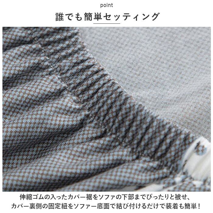 ・伸縮ゴムの入ったカバー裾をソファの下部までぴったりと被せ、カバー裏側の固定紐をソファー底面で結び付けるだけで装着も簡単!