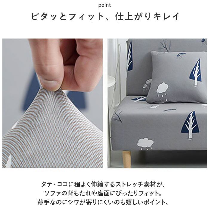 ・タテ・ヨコに程よく伸縮するストレッチ素材が、ソファの背もたれや座面にぴったりフィット。薄手なのにシワが寄りにくいのも嬉しいポイント。