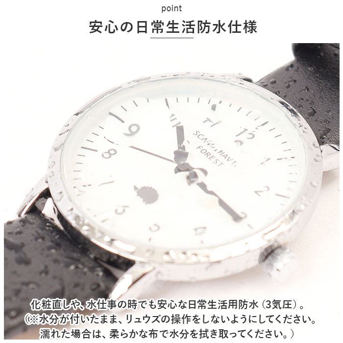 ・パウダールームでの化粧直しや、水仕事の時でも安心な日常生活用防水(3気圧)。(※水分が付いたまま、リュウズの操作をしないようにしてください。濡れた場合は、柔らかな布で水分を拭き取ってください。)