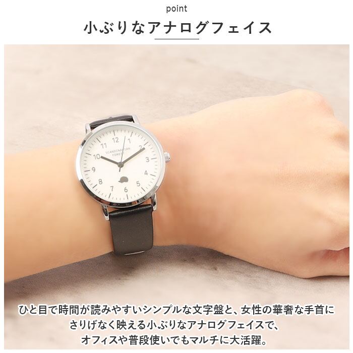 ・ひと目で時間が読みやすいシンプルな文字盤と、女性の華奢な手首にさりげなく映える小ぶりなアナログフェイスで、オフィスや普段使いでもマルチに大活躍。