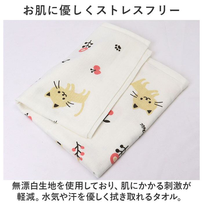 ・無漂白生地を使用しており、肌にかかる刺激が軽減。水気や汗を優しく拭き取れるタオル。