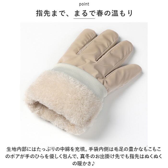 ・生地内部にはたっぷりの中綿を充填。手袋内側は毛足の豊かなもこもこのボアが手のひらを優しく包んで、真冬のお出掛け先でも指先はぬくぬくの暖かさ♪