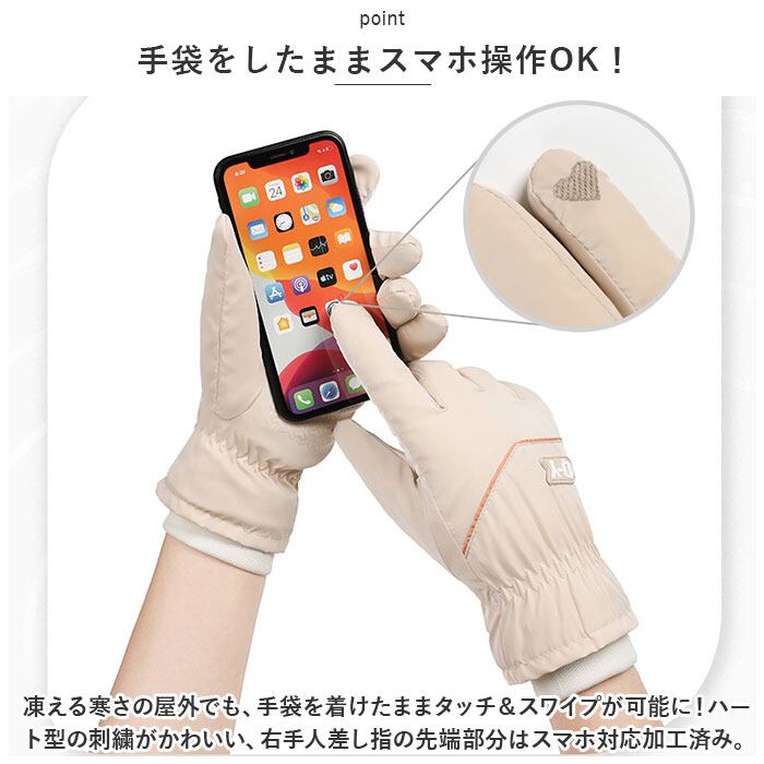 ・凍える寒さの屋外でも、手袋を着けたままタッチ&スワイプが可能に!ハート型の刺繍がかわいい、右手人差し指の先端部分はスマホ対応加工済み。