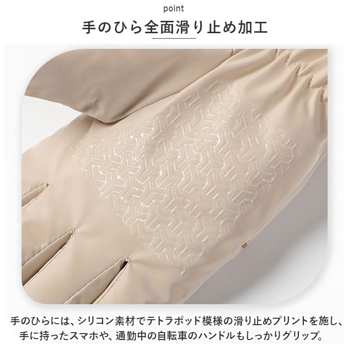・手のひらには、シリコン素材でテトラポッド模様の滑り止めプリントを施し、手に持ったスマホや、通勤中の自転車のハンドルもしっかりグリップ。