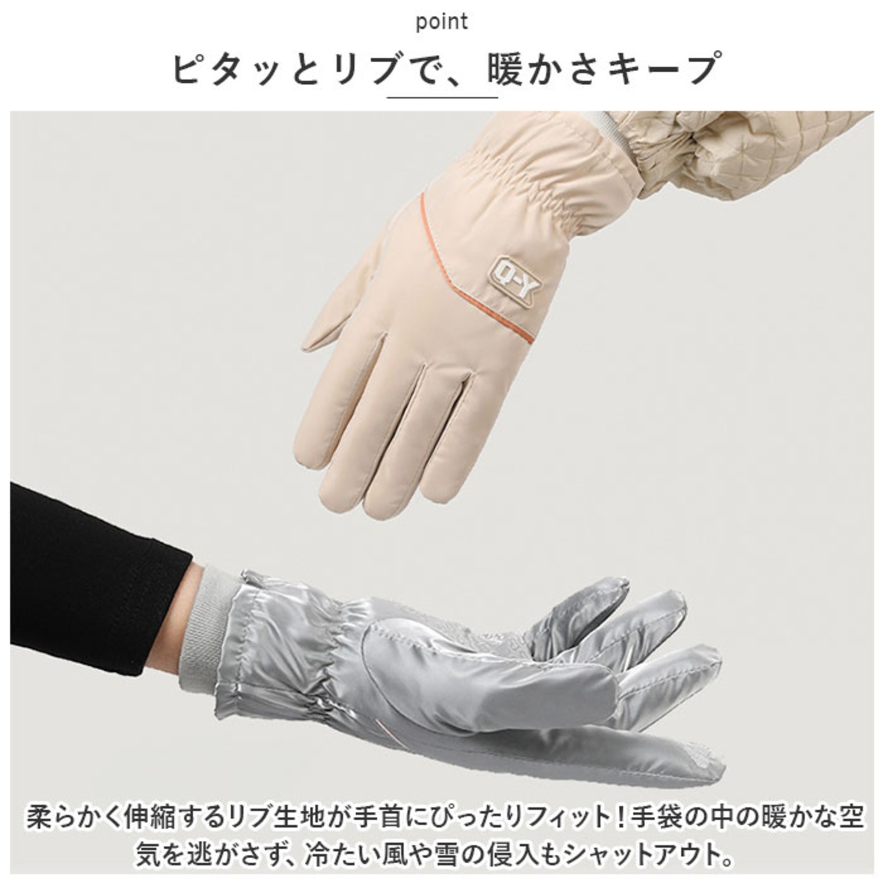 ・柔らかく伸縮するリブ生地が手首にぴったりフィット!手袋の中の暖かな空気を逃がさず、冷たい風や雪の侵入もシャットアウト。