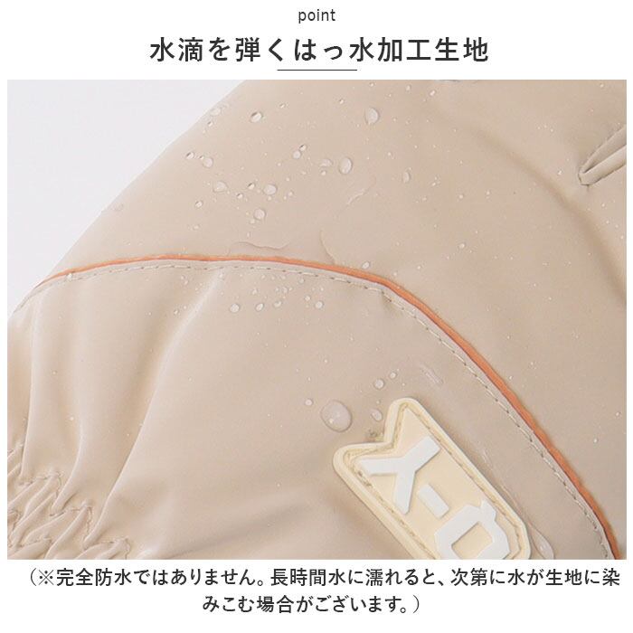 ・ベルベットのようなほのかな光沢と、しっとりとした肌触りが特徴の微起毛生地には、水滴を玉のように弾くはっ水加工済み。普段のお出掛けにはもちろん、スケートなどのウィンタースポーツやお子さまとの雪合戦も一緒に楽しめる!(※完全防水ではありません。長時間水に濡れると、次第に水が生地に染みこむ場合がございます。)