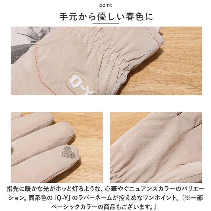 ・指先に暖かな光がポッと灯るような、心華やぐニュアンスカラーのバリエーション。同系色の「Q-Y」のラバーネームが控えめなワンポイント。(※一部ベーシックカラーの商品もございます。)