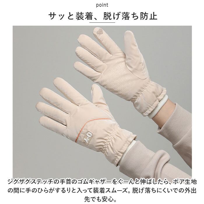 ・ジグザグステッチの手首のゴムギャザーをぐーんと伸ばしたら、ボア生地の間に手のひらがするりと入って装着スムーズ。脱げ落ちにくいでの外出先でも安心。