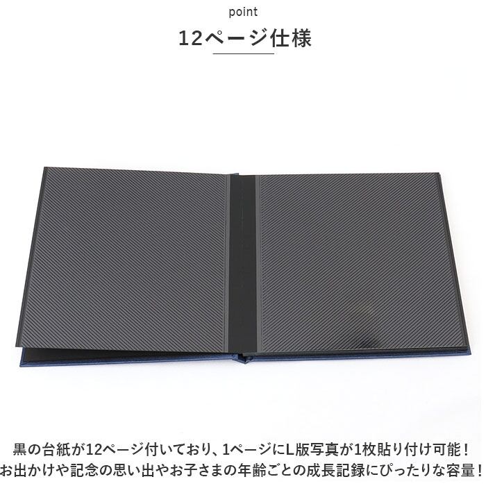 ・黒の台紙が12ページ付いており、1ページにL版写真が1枚貼り付け可能!お出かけや記念の思い出やお子さまの年齢ごとの成長記録にぴったりな容量!