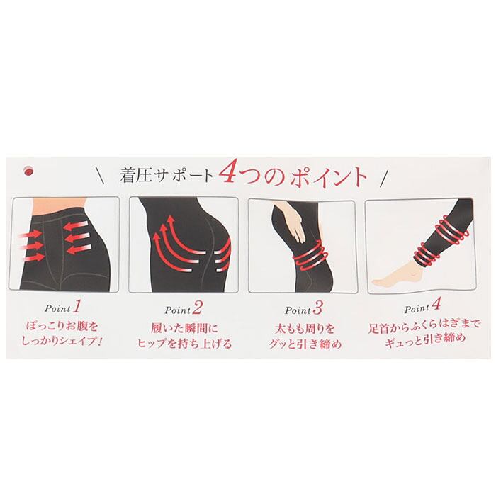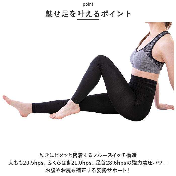 ・動きにピタッと密着するブルースイッチ構造・太もも20.5hps、ふくらはぎ21.0hps、足首28.6hpsの強力着圧パワー・お腹やお尻も補正する姿勢サポート!