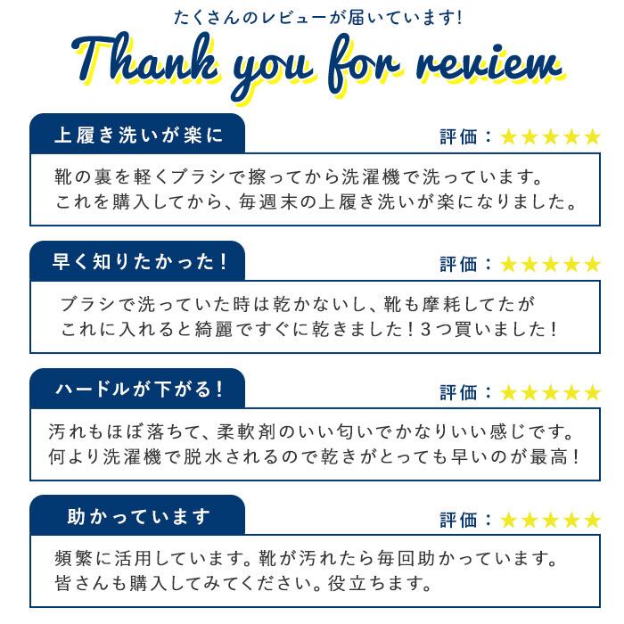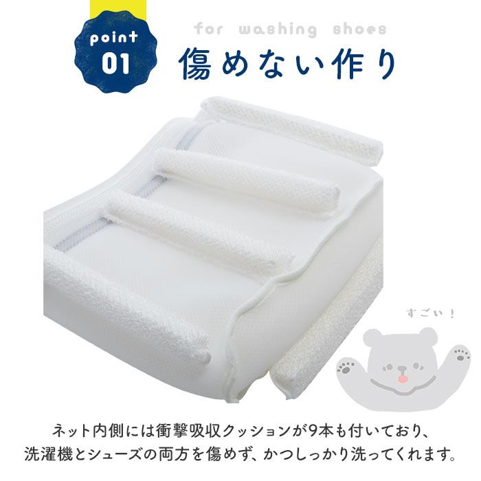 ・クッションメッシュ構造なので優しく洗ってくれる。さらに衝撃吸収クッションが9本(底板1本・柱8本)付いているので、洗濯機・シューズを傷めない。