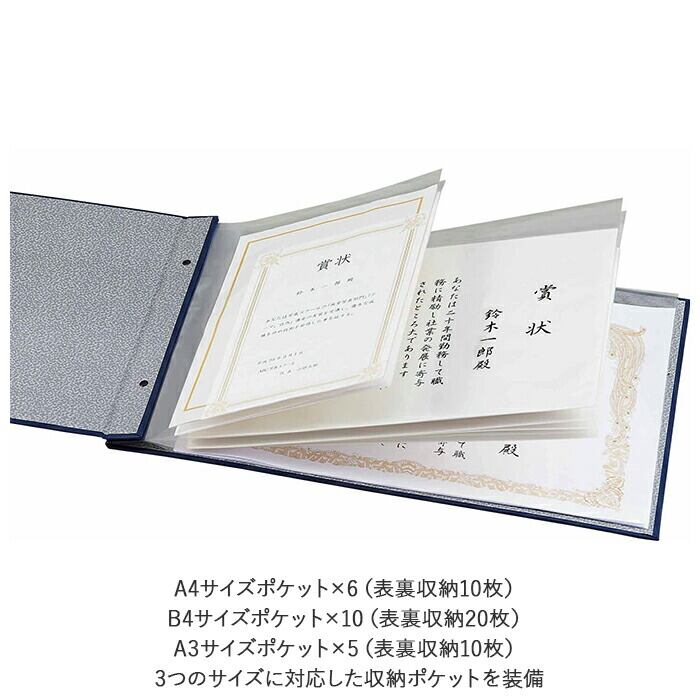 ・A4サイズポケット×6(表裏収納10枚)、B4サイズポケット×10(表裏収納20枚)、A3サイズポケット×5(表裏収納10枚)3つのサイズに対応した収納ポケットを装備。