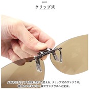 ・メガネにクリップを挟むだけで使える、クリップ式のサングラス。普段のメガネから一瞬でサングラスへと変身。
