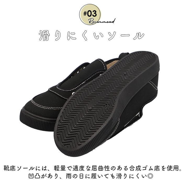 ・靴底ソールには、軽量で適度な屈曲性のある合成ゴム底を使用。凹凸があり、雨の日に履いても滑りにくい◎さらにインソールは柔らかな履き心地で疲れにくいのも嬉しい。