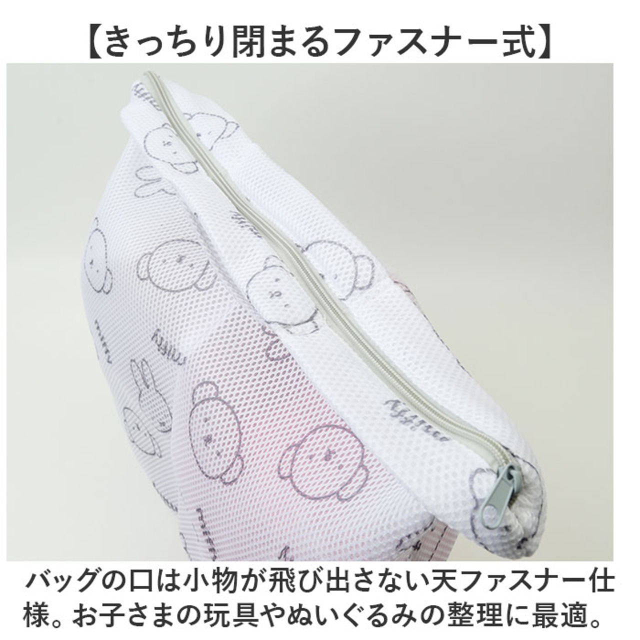 ・バッグの口は小物が飛び出さない天ファスナー仕様。お子さまの玩具やぬいぐるみの整理に最適。