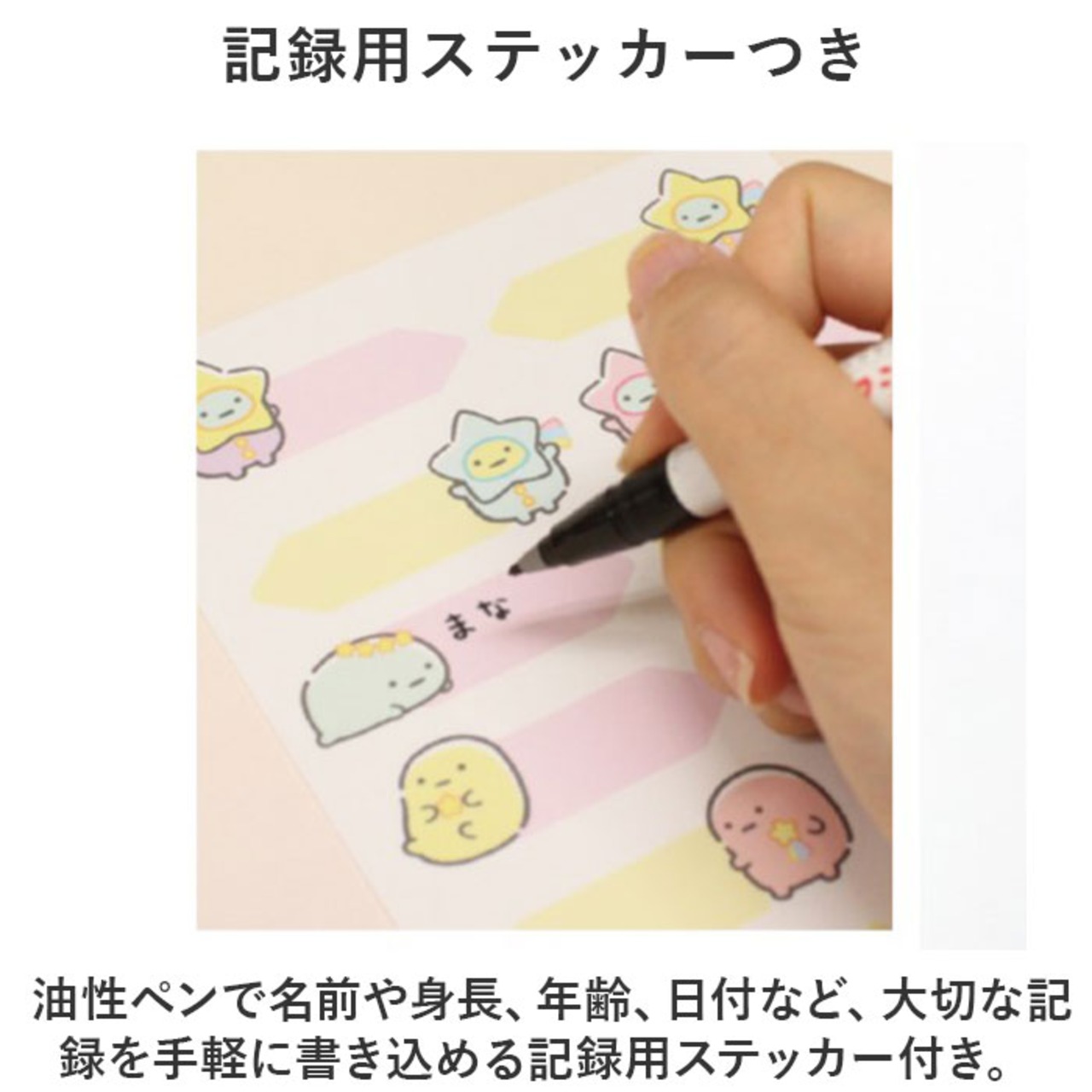 ・油性ペンで名前や身長、年齢、日付など、大切な記録を手軽に書き込める記録用ステッカー付き。