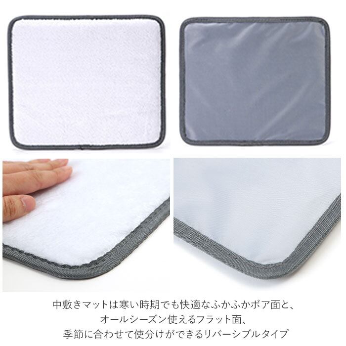 ・中敷きマットは寒い時期でも快適なふかふかボア面と、オールシーズン使えるフラット面、季節に合わせて使分けができるリバーシブルタイプ。