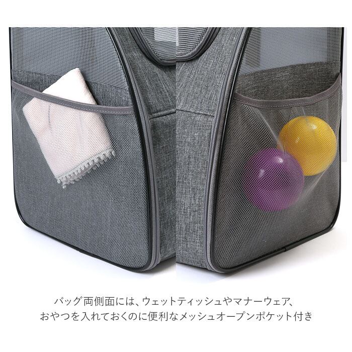 ・バッグ両側面には、ウェットティッシュやマナーウェア、おやつを入れておくのに便利なメッシュオープンポケット付き。