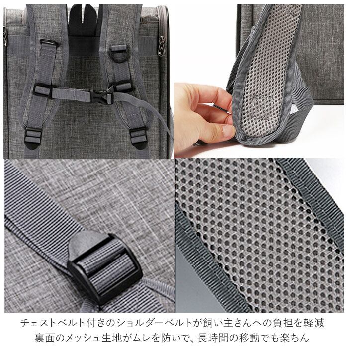 ・チェストベルト付きのショルダーベルトが飼い主さんへの負担を軽減。裏面のメッシュ生地がムレを防いで、長時間の移動でも楽ちん。