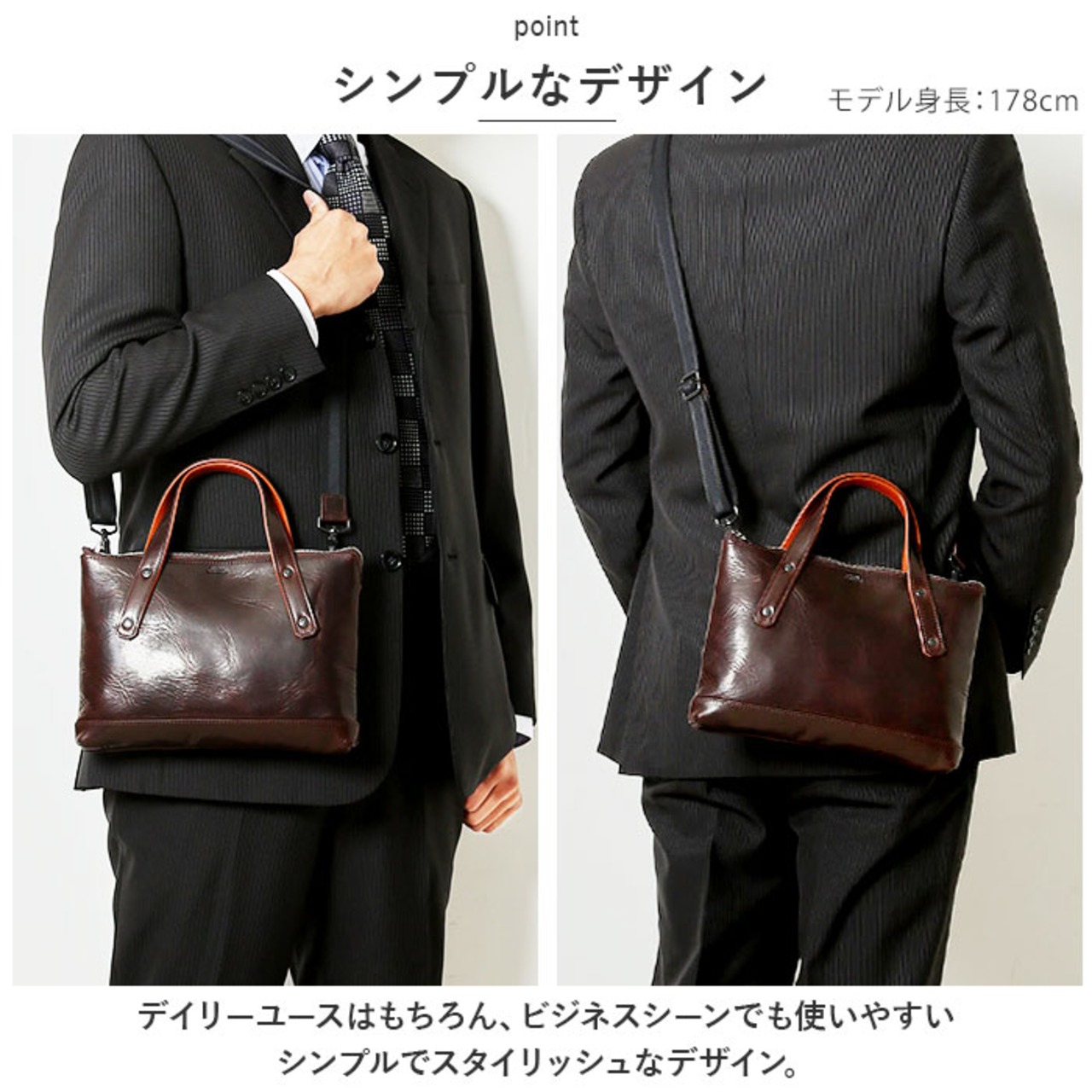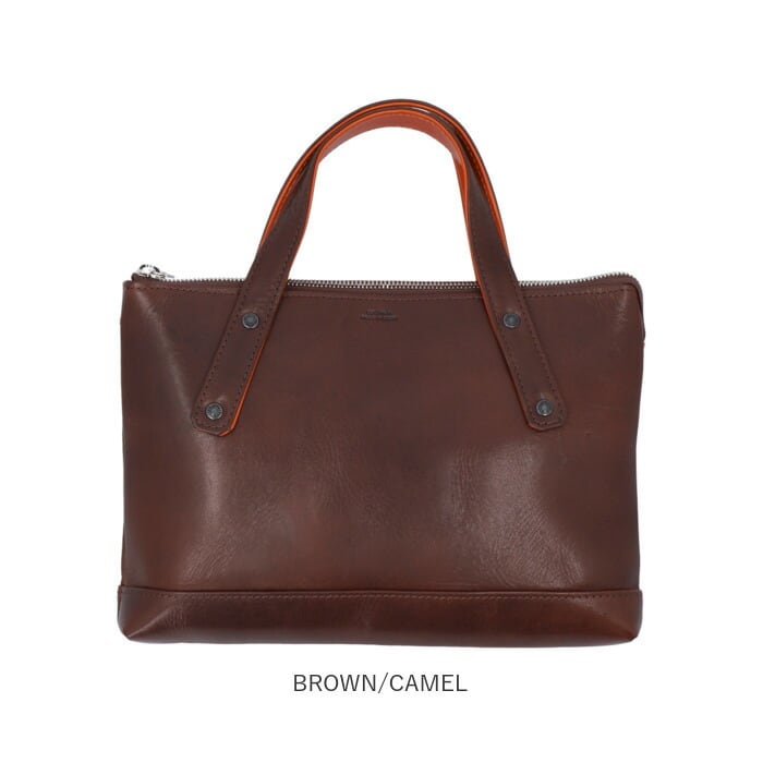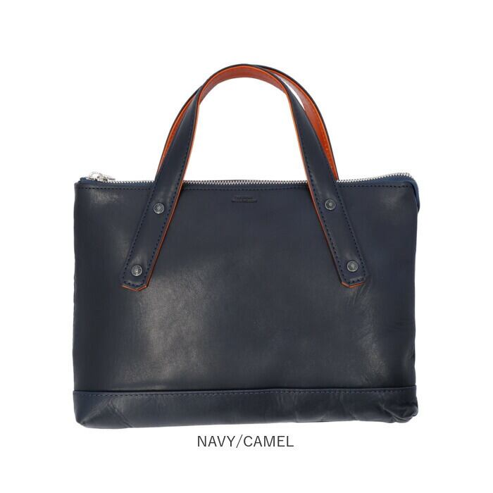 ・ハンドルの内側など一部に異なるカラーのレザーを使用。また、バッグ内のレザーパッチやフロントの型押し、ボタンにさりげなくロゴを刻印。