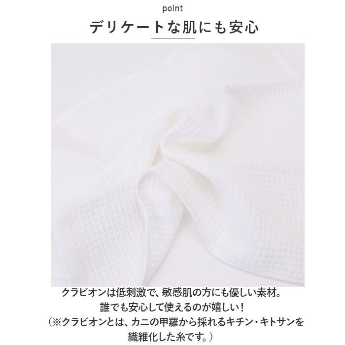 ・クラビオンは低刺激で、敏感肌の方にも優しい素材。誰でも安心して使えるのが嬉しい!(※クラビオンとは、カニの甲羅から採れるキチン・キトサンを繊維化した糸です。)