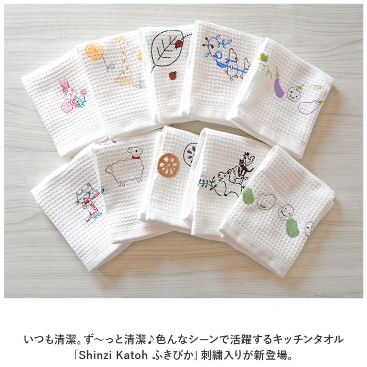 ・いつも清潔。ず~っと清潔♪色んなシーンで活躍するキッチンタオル「Shinzi Katoh ふきぴか」刺繍入りが新登場。