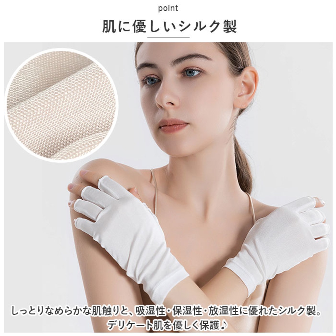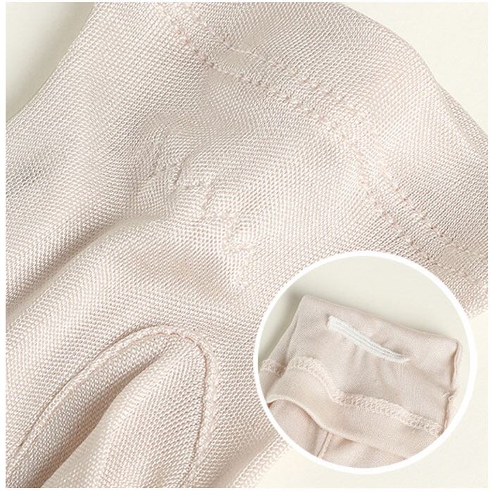 ・しっとりなめらかな肌触りと、吸湿性・保湿性・放湿性に優れたシルク製。デリケート肌を優しく保護♪
