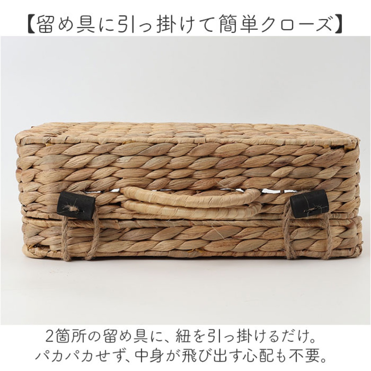 ・2箇所の留め具に、紐を引っ掛けるだけ。パカパカせず、中身が飛び出す心配も不要。