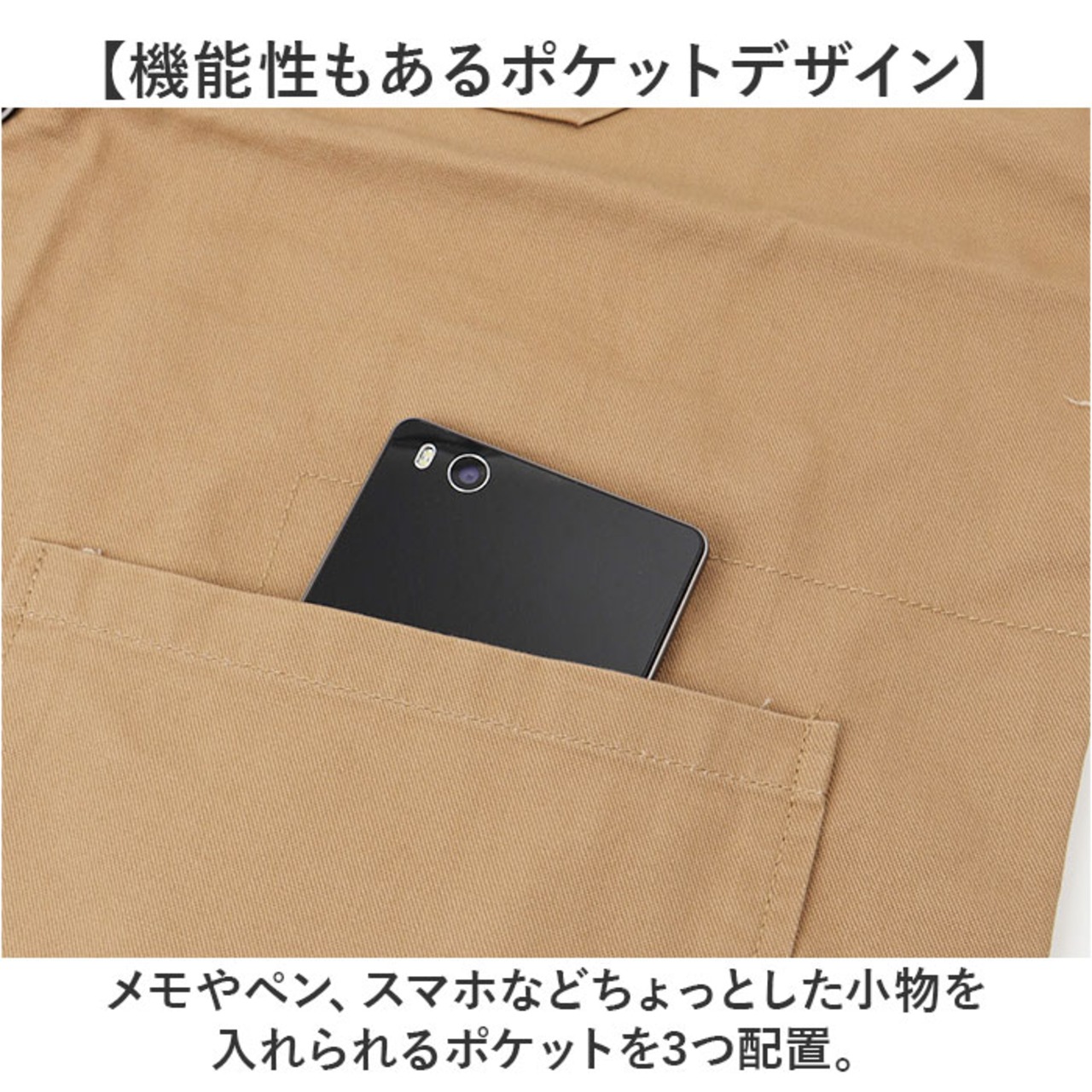 ・メモやペン、スマホなどちょっとした小物を入れられるポケットを3つ配置。