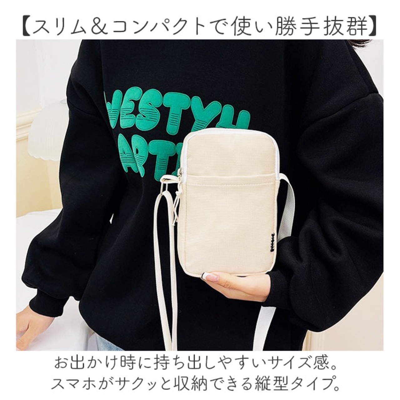 ・お出かけ時に持ち出しやすいサイズ感。スマホがサクッと収納できる縦型タイプ。