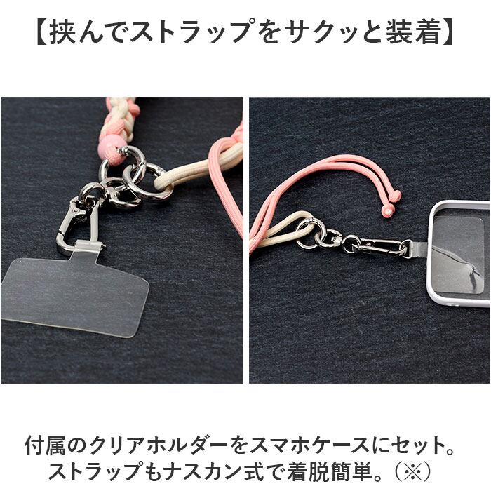 ・付属のクリアホルダーをスマホケースにセット。ストラップもナスカン式で着脱簡単。