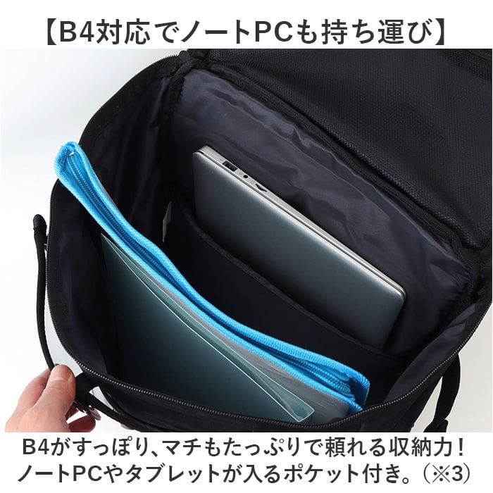 ・B4がすっぽり、マチもたっぷりで頼れる収納力!ノートPCやタブレットが入るポケット付き。