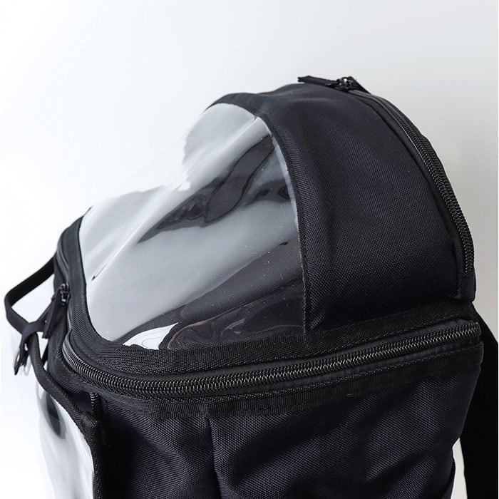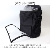 ・前面:上部スナップボタン&両サイドファスナー式クリアポケット×1(内側にベルトループ×6)