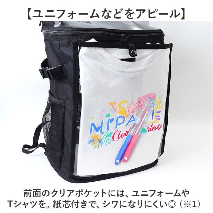 ・前面のクリアポケットには、ユニフォームやTシャツを。紙芯付きで、シワになりにくい◎