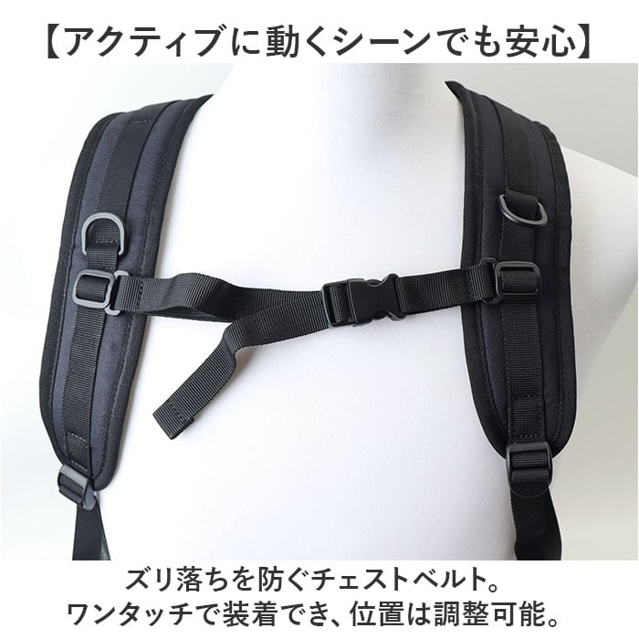 ・ズリ落ちを防ぐチェストベルト。ワンタッチで装着でき、位置は調整可能。