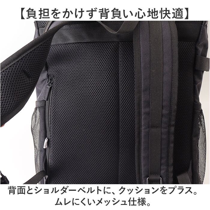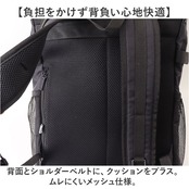 ・背面とショルダーベルトに、クッションをプラス。ムレにくいメッシュ仕様。