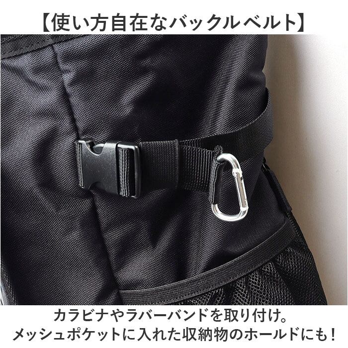 ・カラビナやラバーバンドを取り付け。メッシュポケットに入れた収納物のホールドにも!
