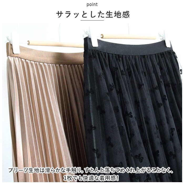 ・プリーツ生地は滑らかな手触り。すとんと落ちてめくれ上がることなく、1枚でも快適な着用感!