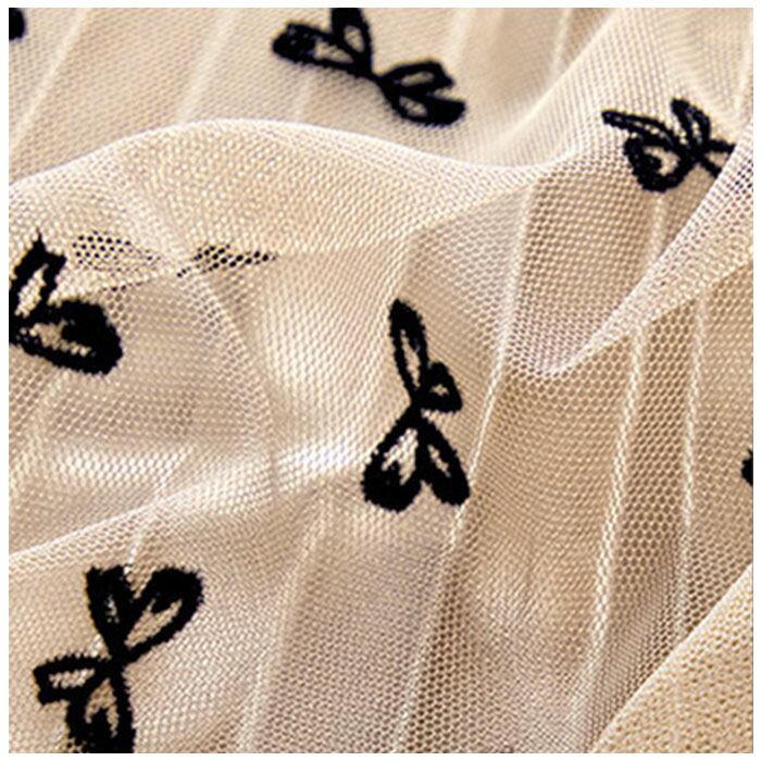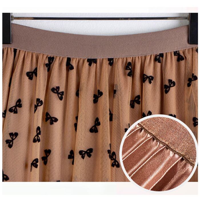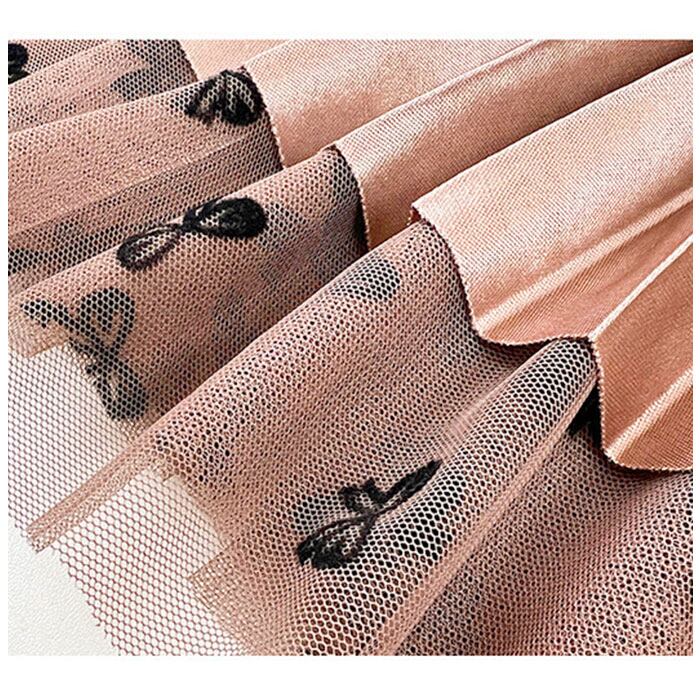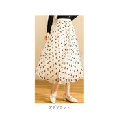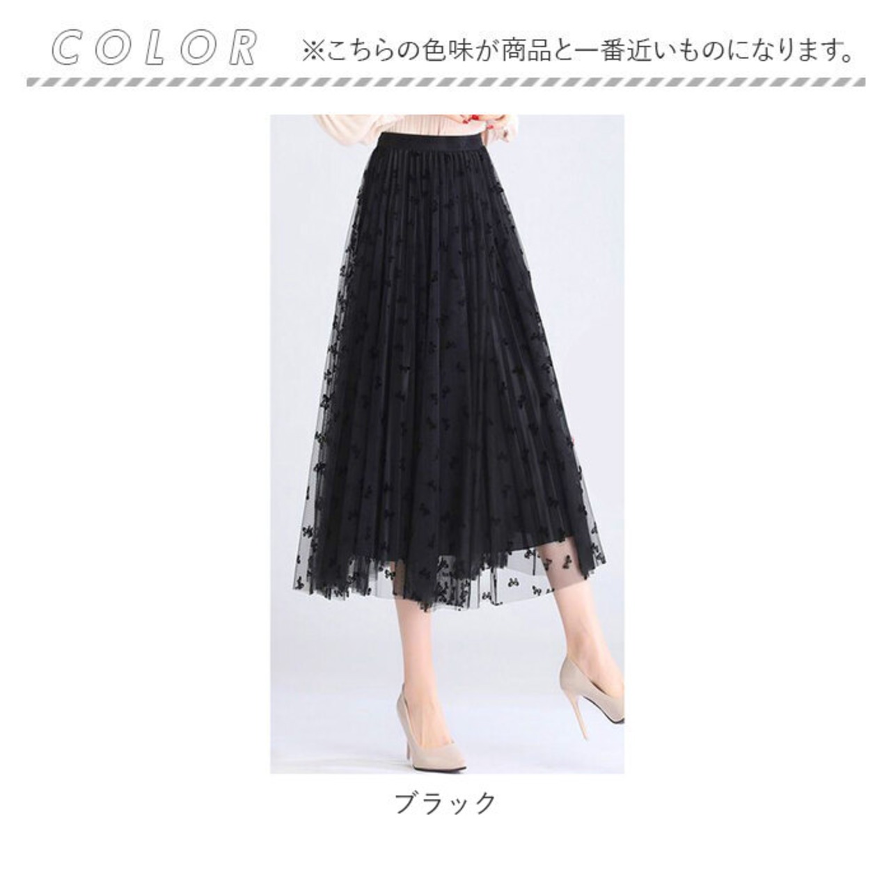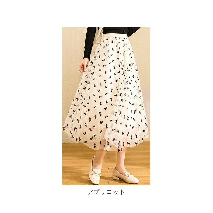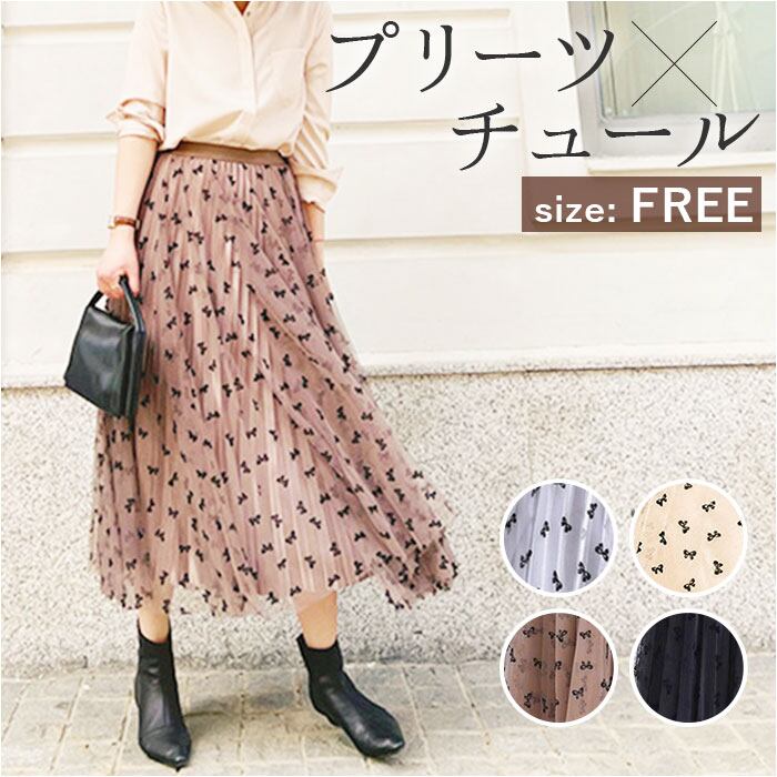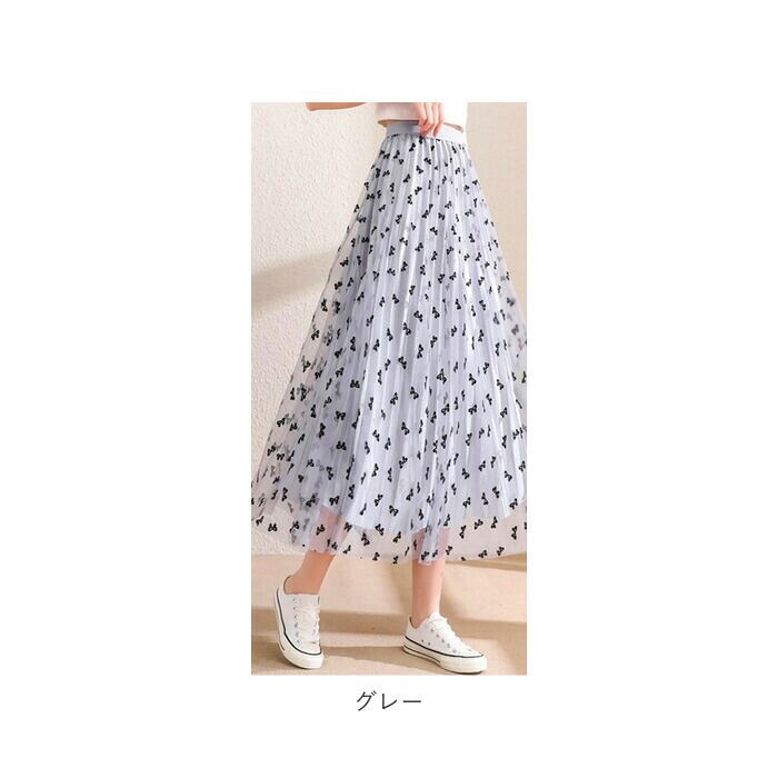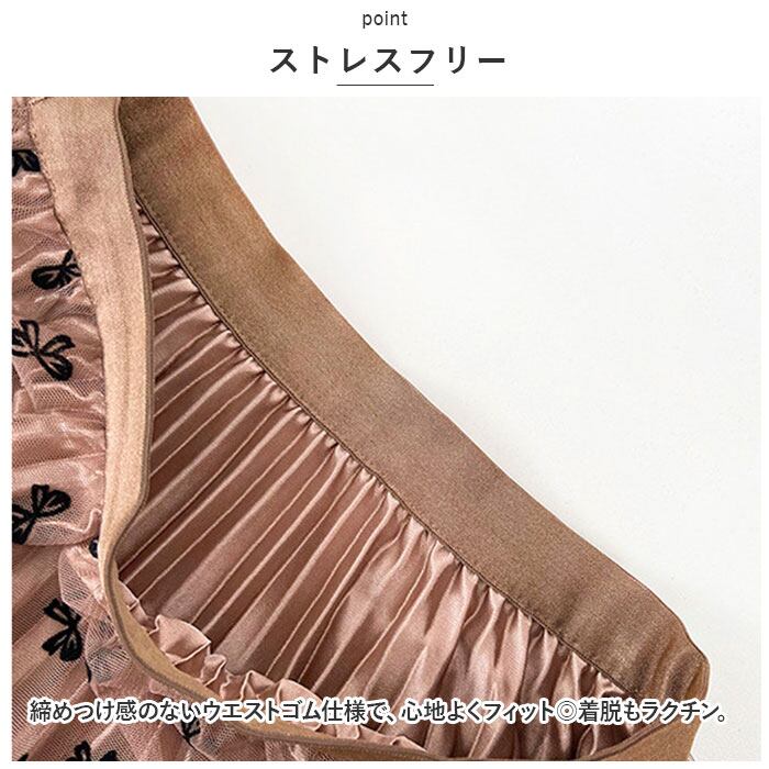 ・光沢のあるプリーツ生地にチュールを重ね、上品に仕上げたロングスカート。全体に施されたリボンデザインがポイント。